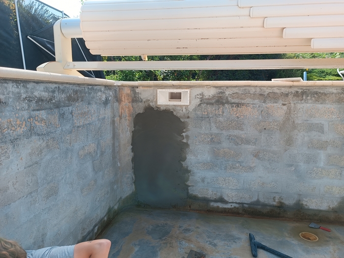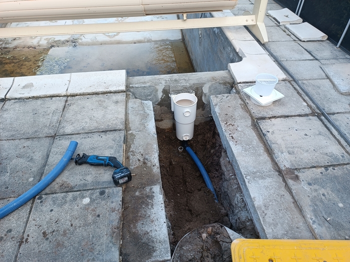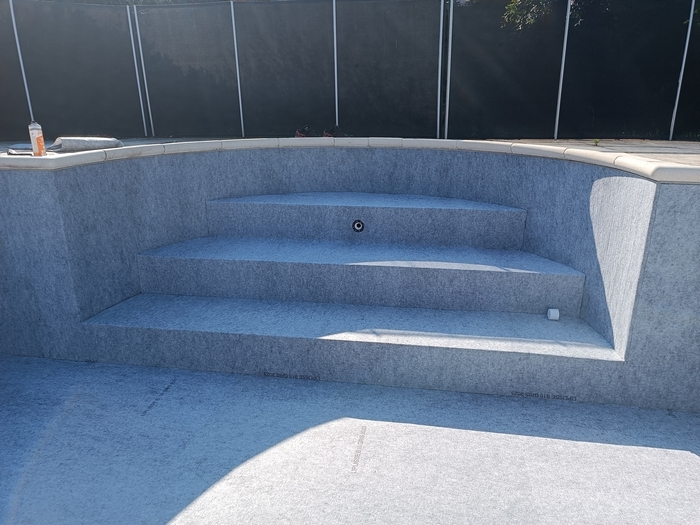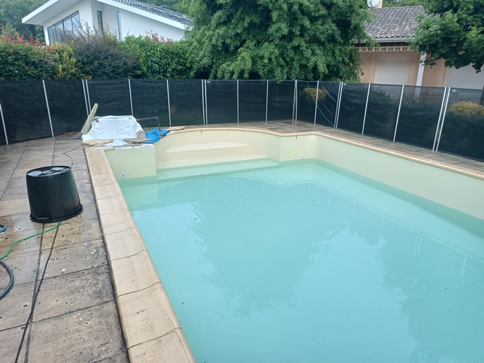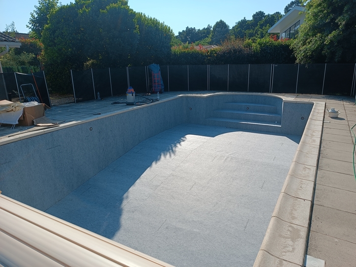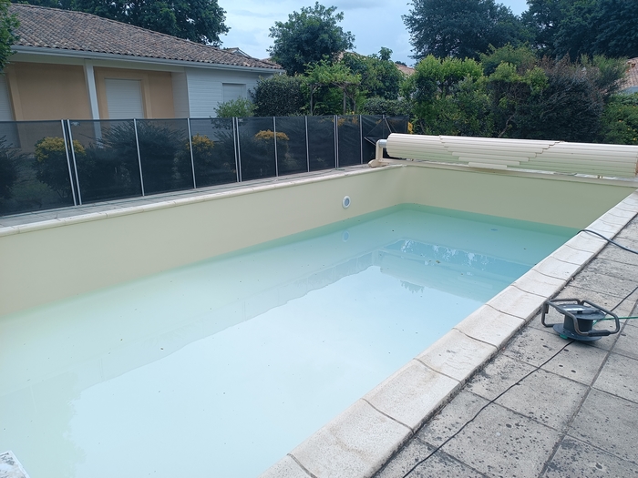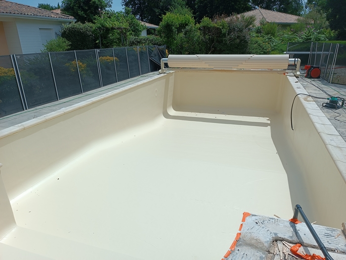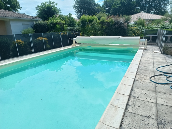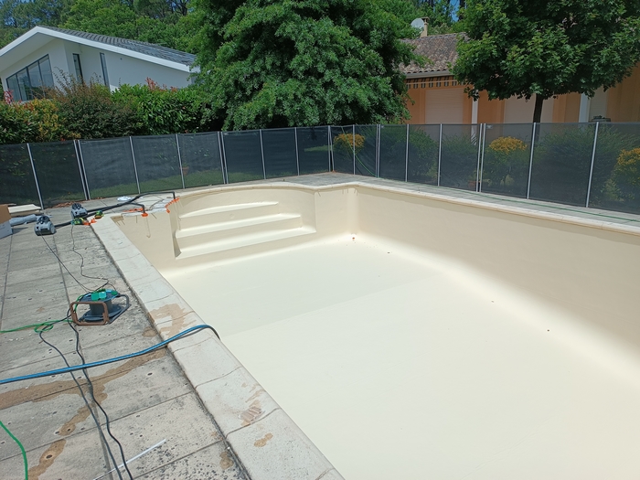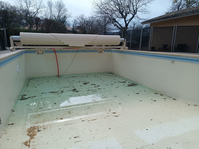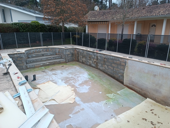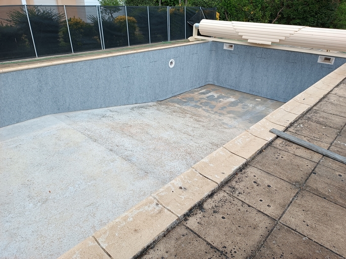Rénovation de cette piscine de 10m x 5m avec escalier roman à Andernos-les-bains : remplacement des 2 skimmers, changement des tuyaux de raccordement qui avaient été déformés par le chlore avec modification de la nourrice d’aspiration (1 tuyau par skimmer), installation d’un spot LED et pose d’un liner 85/100 sable.