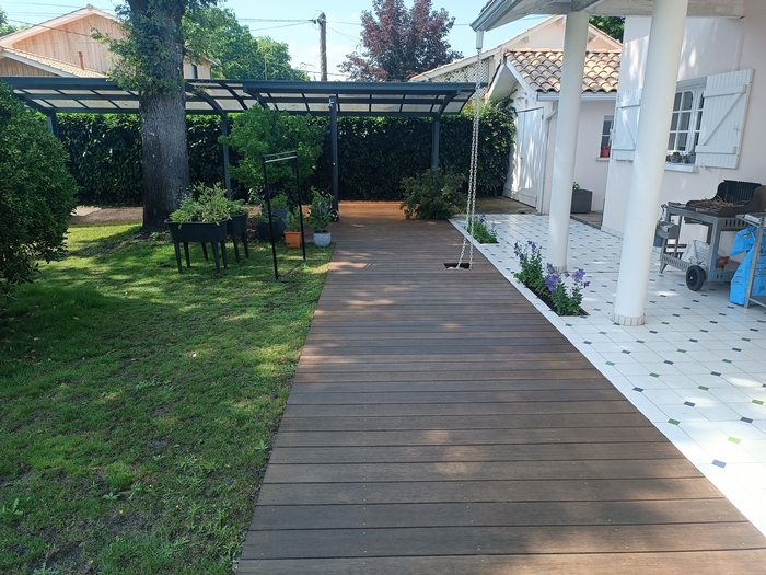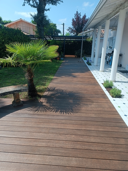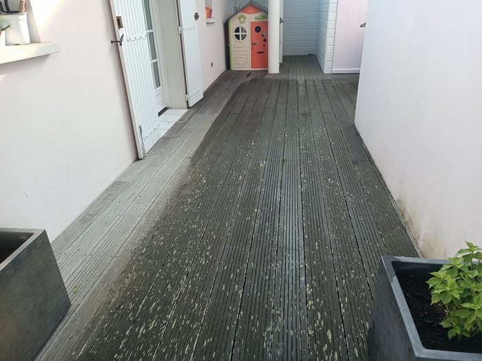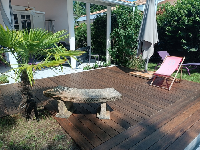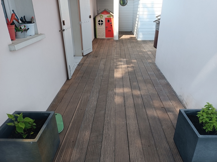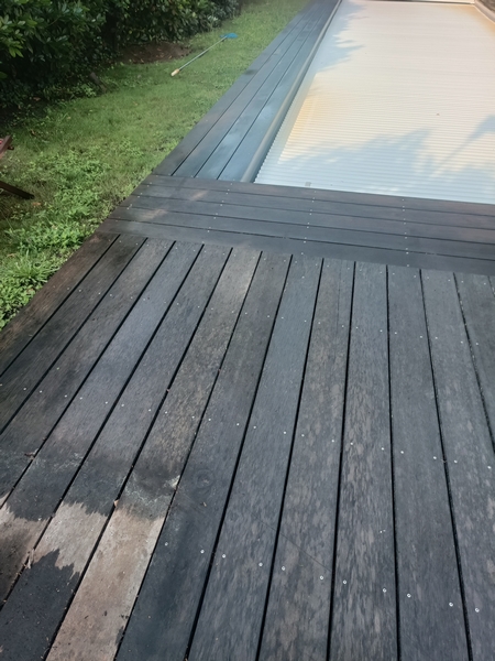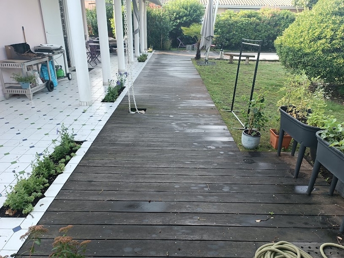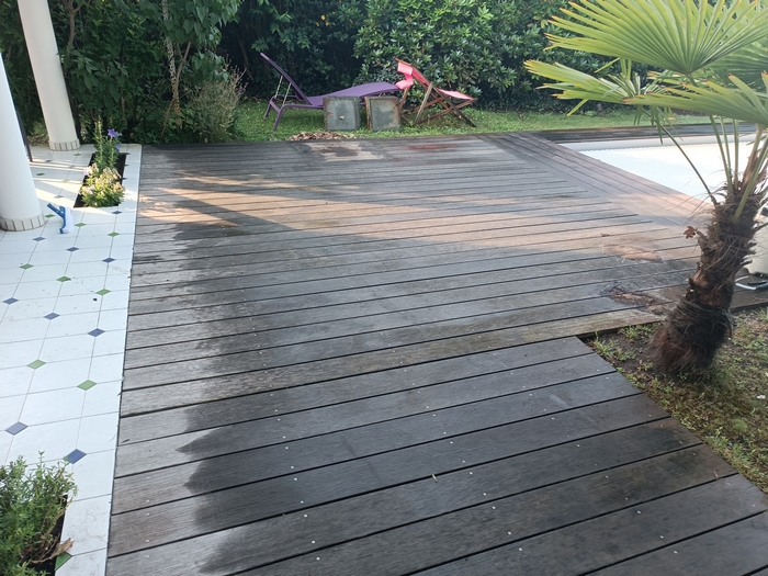 Cette terrasse en bois exotique n’avait pas été entretenue depuis bien longtemps : les photos parlent d’elles-mêmes ! Après l’application du produit nettoyant dégrisant, le passage de notre machine respectant les fibres du bois et l’application de deux couches de saturateur, cette terrasse a retrouvé son état neuf.