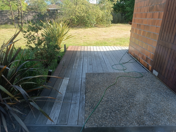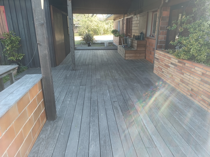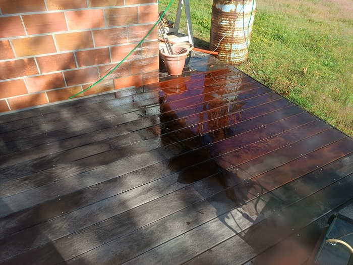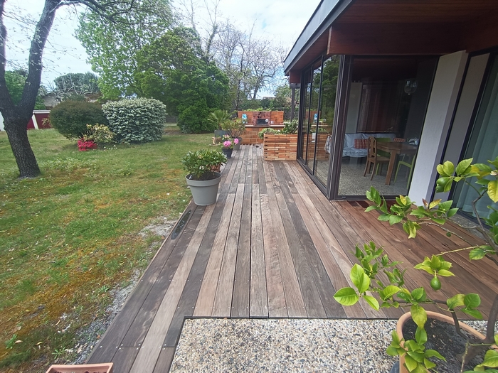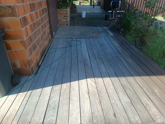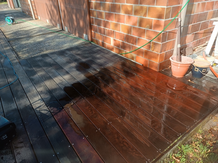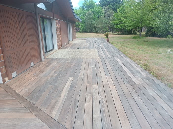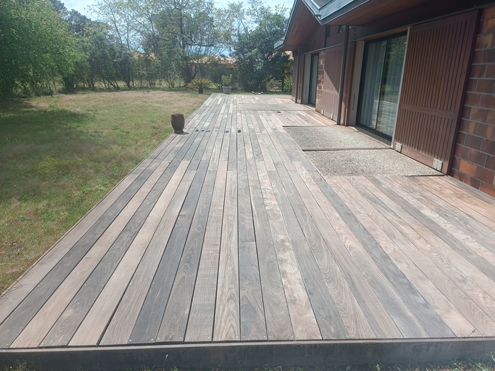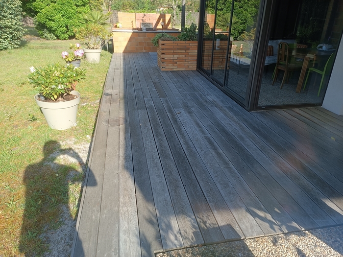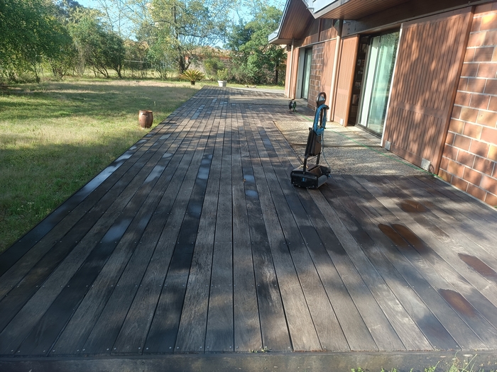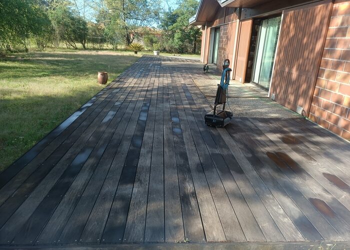 Application du produit nettoyant dégrisant et passage de notre machine respectant les fibres du bois pour cette terrasse de 165m2 à Taussat-les-bains : un joli résultat contribuant à la durabilité de bois.