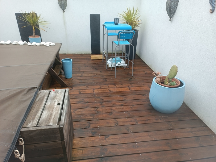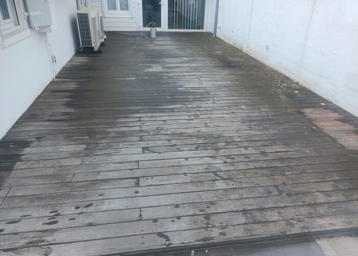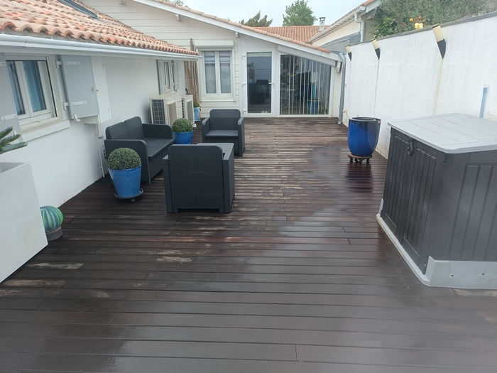 Application du produit nettoyant dégrisant et passage de notre machine respectant les fibres du bois pour cette terrasse de 75m2 à La Teste-de-Buch dont une partie est en bois exotique et l’autre en pin : un joli résultat contribuant à la durabilité de bois.